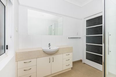 The main bedroom is equipped with a built-in robe and a split system for added comfort, along with an ensuite bathroom. The second bedroom is ideal for guests or as a home office, with convenient access to the main bathroom. The main bathroom is combined with the laundry for space efficiency.